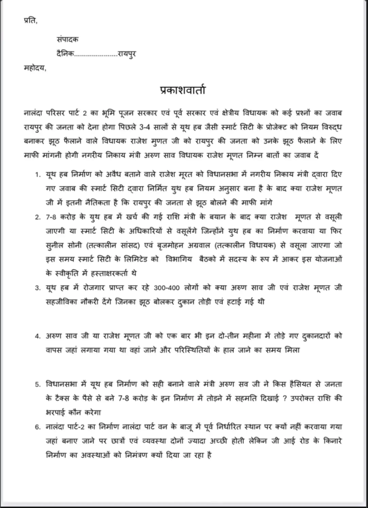 मेनन ने आरोप लगाया कि पिछले 3-4 सालों से स्मार्ट सिटी के तहत बने यूथ हब को नियम के खिलाफ बताकर जनता को गुमराह किया गया। जबकि विधानसभा में नगरीय निकाय मंत्री अरुण साव के जवाब में साफ हो चुका है कि यूथ हब नियमों के अनुसार बना था। इसके बावजूद इसे अवैध बताकर तोड़ा गया, जो जनता के साथ धोखा है।