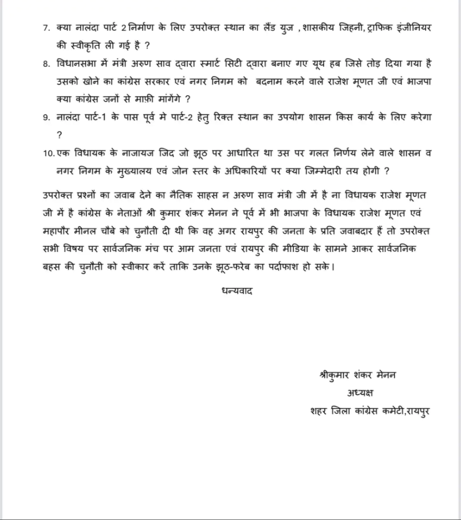 Chhattisgarh Time news: रायपुर में नालंदा परिसर पार्ट-2 के निर्माण को लेकर कांग्रेस ने भाजपा सरकार से 10 सवाल पूछे हैं। कांग्रेस नेता श्रीकुमार मेनन ने कहा कि नालंदा पार्ट-2 का भूमि पूजन करने से पहले सरकार, पूर्व सरकार और क्षेत्रीय विधायक को रायपुर की जनता के सामने कई सवालों के जवाब देने चाहिए