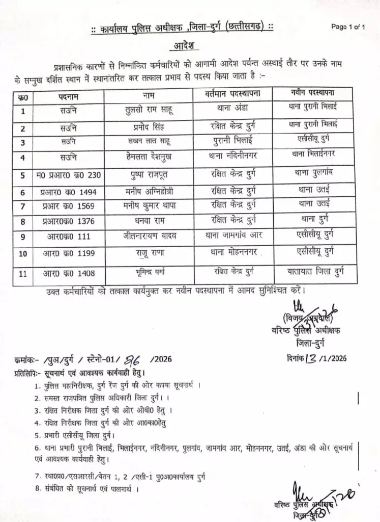 Durg. दुर्ग। प्रशासनिक आवश्यकताओं के चलते दुर्ग पुलिस विभाग ने 11 कर्मचारियों को तत्काल प्रभाव से नई पदस्थापना में स्थानांतरित करने का आदेश जारी किया है। यह आदेश वरिष्ठ पुलिस अधीक्षक विजय अग्रवाल द्वारा जारी किया गया है और आगामी आदेश तक लागू रहेगा। सूत्रों के अनुसार, आदेश में स्पष्ट किया गया है कि कर्मचारियों को उनके वर्तमान पदस्थापना स्थान से नवीन पदस्थापना में तत्काल आमद सुनिश्चित करनी होगी। इस क्रम में शामिल कर्मचारी विभिन्न थानों और रक्षित केन्द्रों से नई जिम्मेदारियों के लिए नियुक्त किए गए हैं।