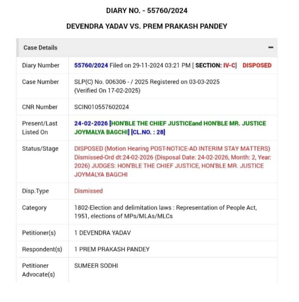 नई दिल्ली। 65-भिलाई नगर विधानसभा निर्वाचन से जुड़ी चुनाव याचिका में विधायक देवेंद्र यादव को सुप्रीम कोर्ट से बड़ा झटका लगा है। सर्वोच्च न्यायालय ने छत्तीसगढ़ उच्च न्यायालय के आदेश के खिलाफ दायर उनकी विशेष अनुमति याचिका (SLP) को निराधार मानते हुए खारिज कर दिया। अब देवेंद्र यादव को हाईकोर्ट में चुनाव याचिका का सामना करना होगा।